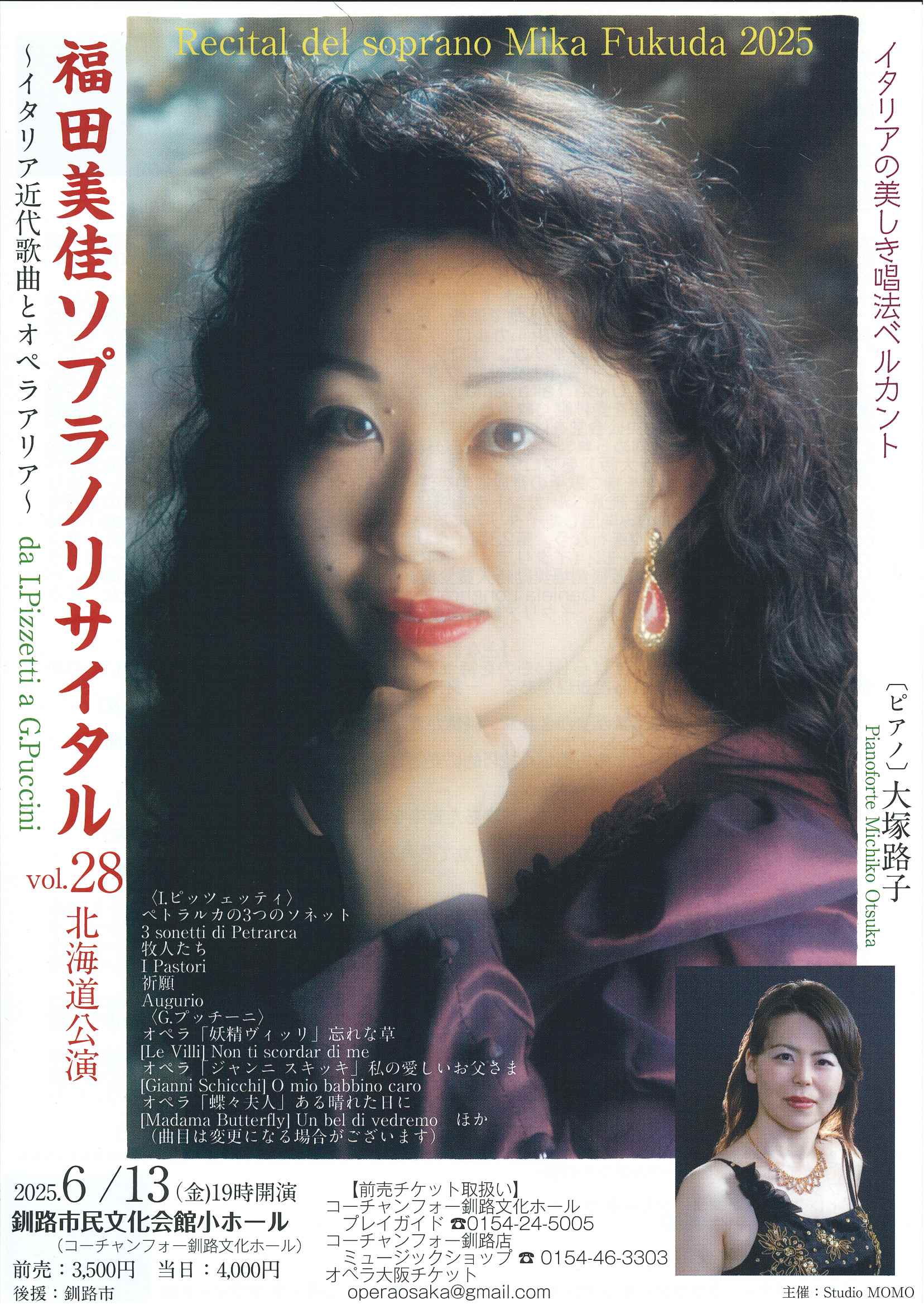 1 E-mail(operaosaka@gmail.com)で「プッチーニ歌曲集・郵便振込」と明記の上、住所・氏名・電話番号・希望枚数をお送りください。